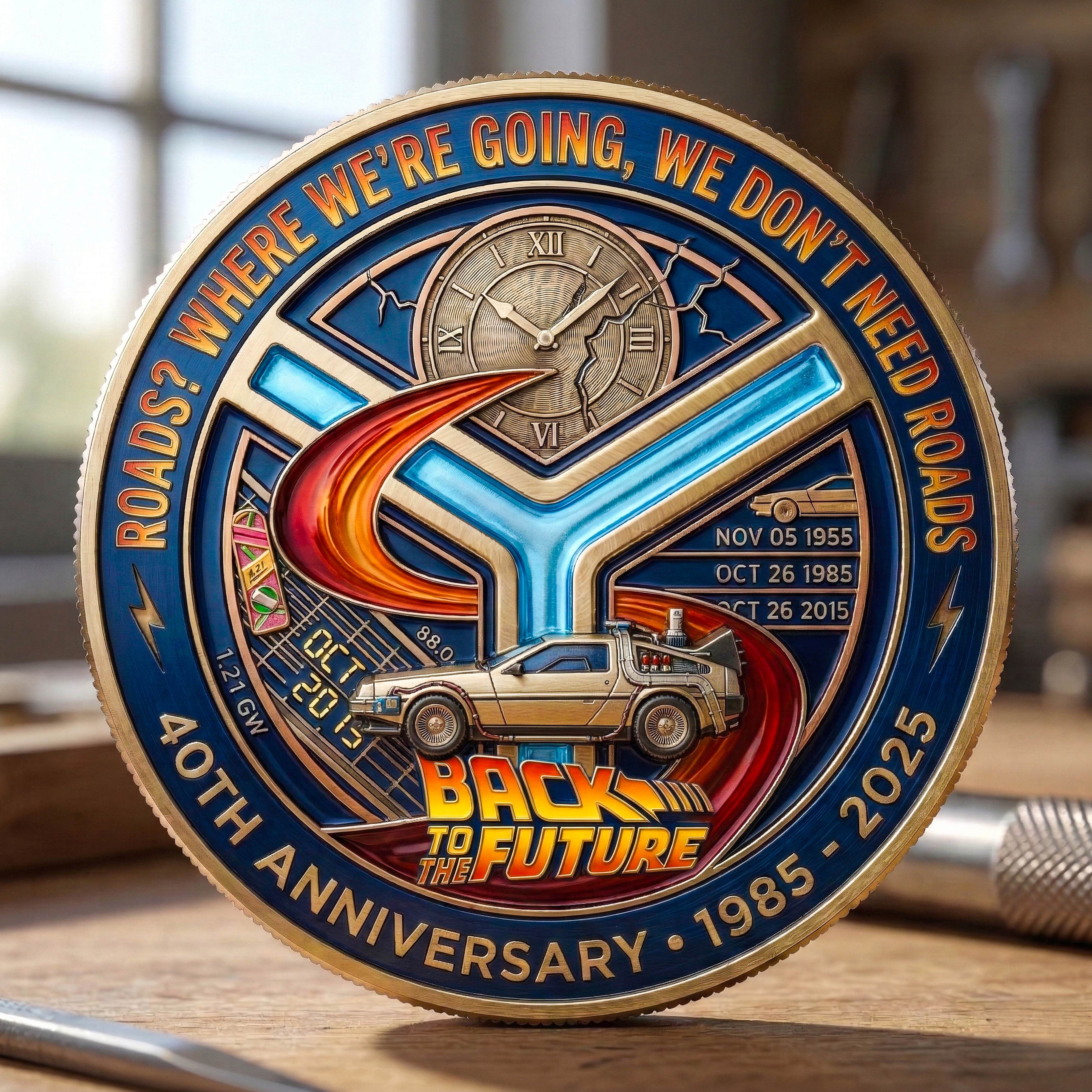 ⏳🚗1985–2025 Limited Collector Edition.“Roads? Where we’re going, we don’t need roads.”Celebrate 40 years of time-traveling adventure with this Back to the Future 40th Anniversary Collector Coin. Inspired by one of cinema’s most iconic sci-fi classics, this commemorative piece honors four decades of innovation, nostalgia, and timeless storytelling.