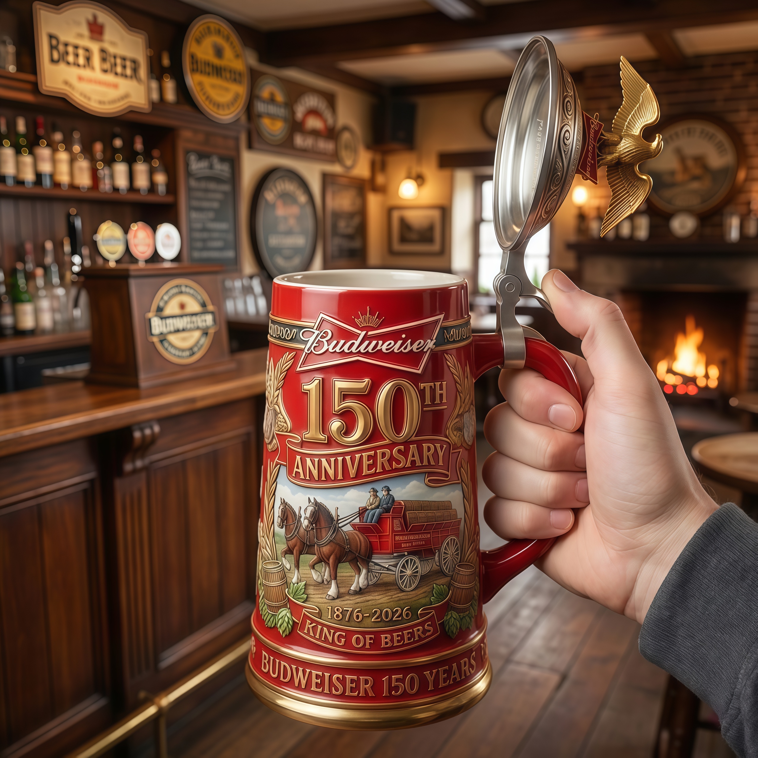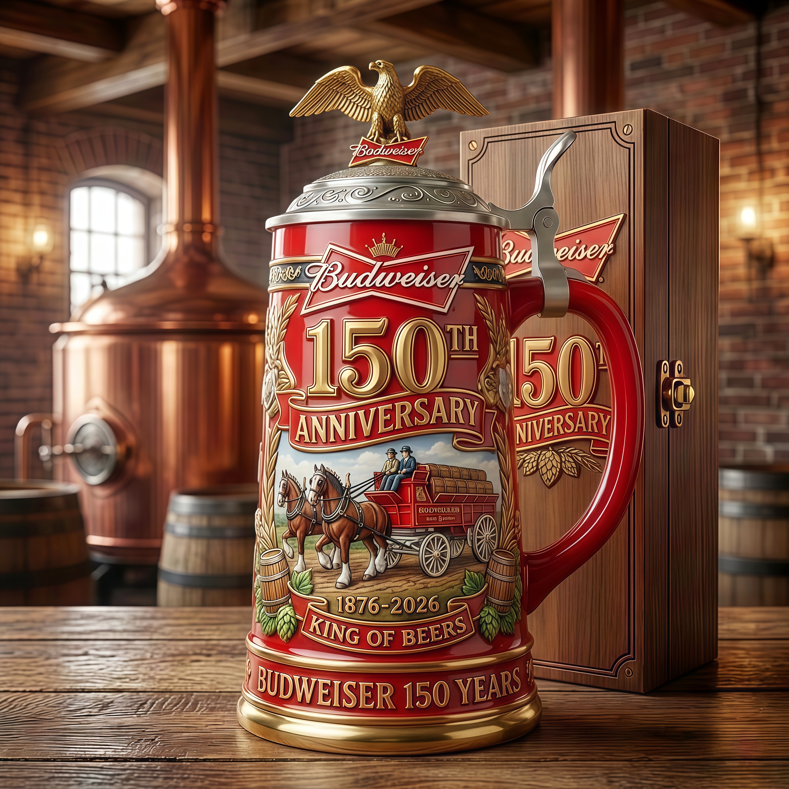 From the gleam of the golden eagle to the storytelling artwork that reflects generations of dedication, this stein brings history to life in every detail. It evokes shared toasts, unforgettable moments, and the enduring legacy behind the name proudly known as the “King of Beers.”