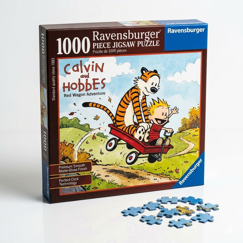🐯🧩Recapture the pure joy and boundless imagination of childhood with the delightful Ravensburger Calvin and Hobbes Red Wagon Adventure 1000-Piece Jigsaw Puzzle — a premium tribute to one of the most beloved comic strips of all time!
