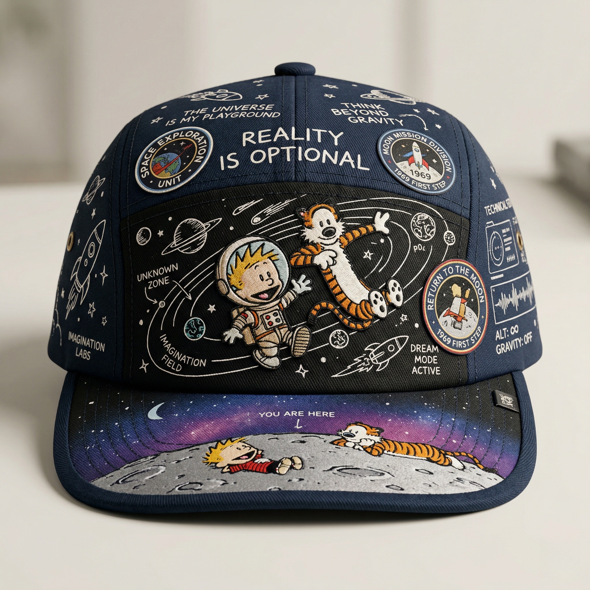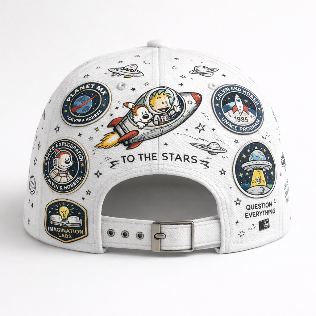 🌙 From the comic-style space artwork to the playful patches and moon-scene brim, every detail feels like classic Calvin and Hobbes energy — curious, fun, and full of imagination.