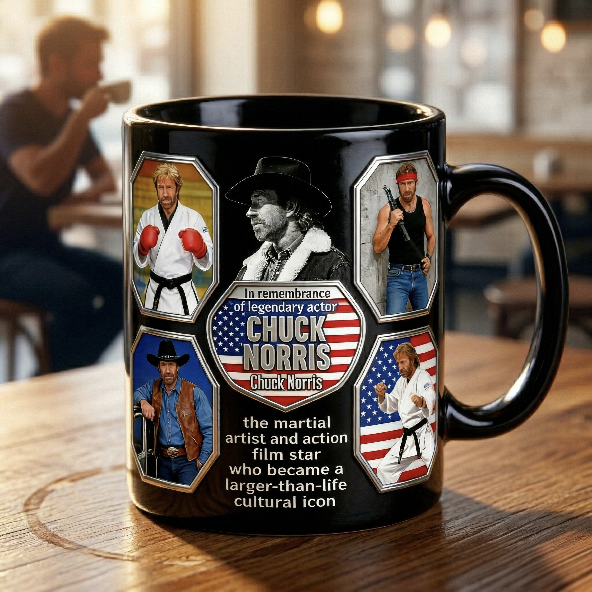 This mug celebrates Chuck Norris, the martial artist and action film star who became a cultural icon. 💪✨
