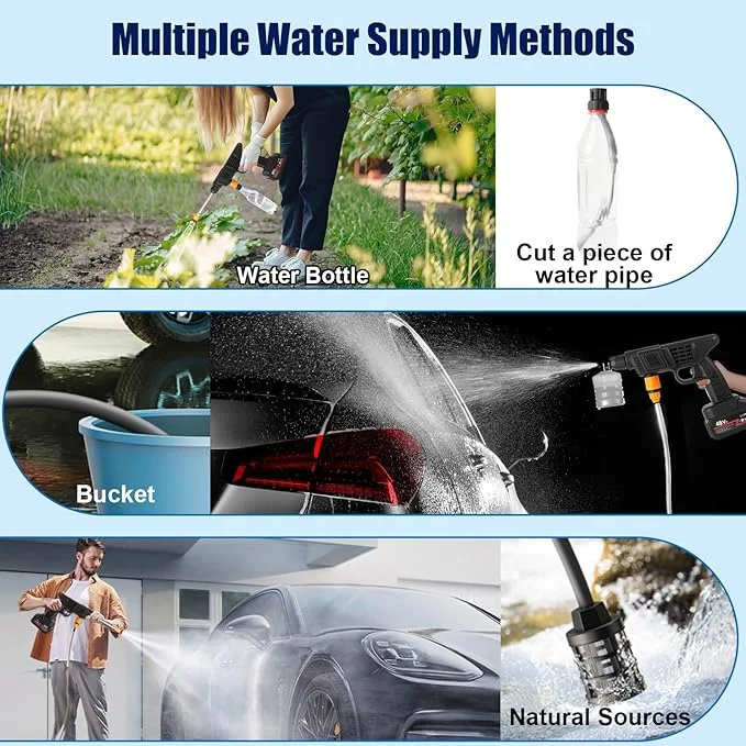 Designed for ultimate portability and performance, this cordless pressure washer frees you from tangled power cords and limited outlet access. Powered by two 48V Li-ion batteries, it delivers reliable high-pressure cleaning for all your outdoor needs—from washing your car to scrubbing your patio, cleaning garden tools, and more.