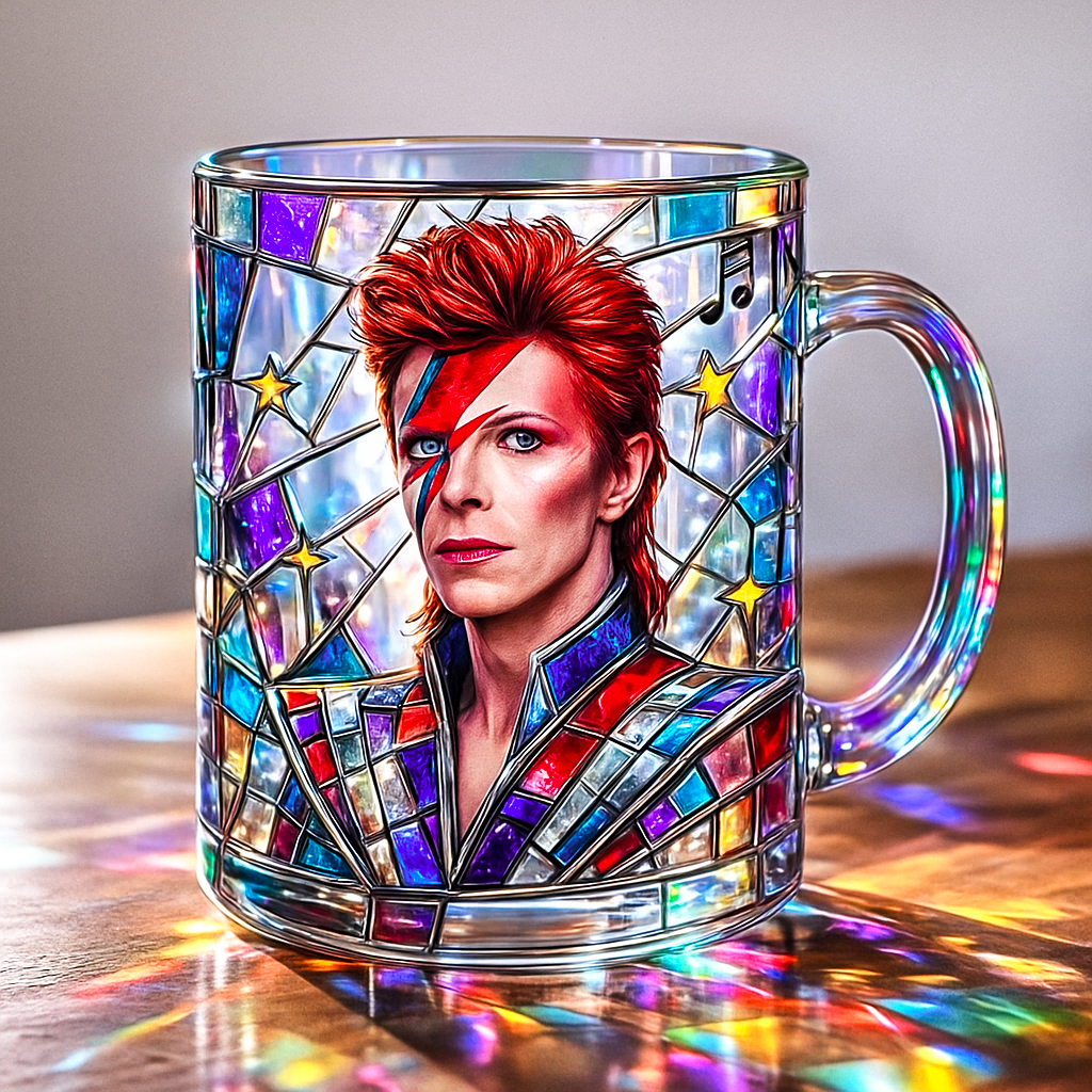 🎸🔥Celebrate the cosmic chaos of David Bowie’s Ziggy Stardust era with this iridescent glass mug– a vivid tribute to one of rock’s most iconic personas.