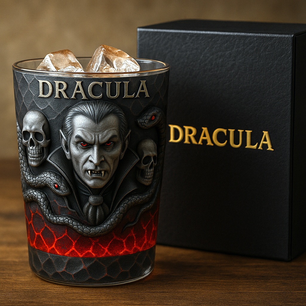 💀 Sculpted with Dracula’s piercing gaze, venomous serpents, and blood-red fire, it’s more than a glass — it’s a relic of fear, power, and eternal night.