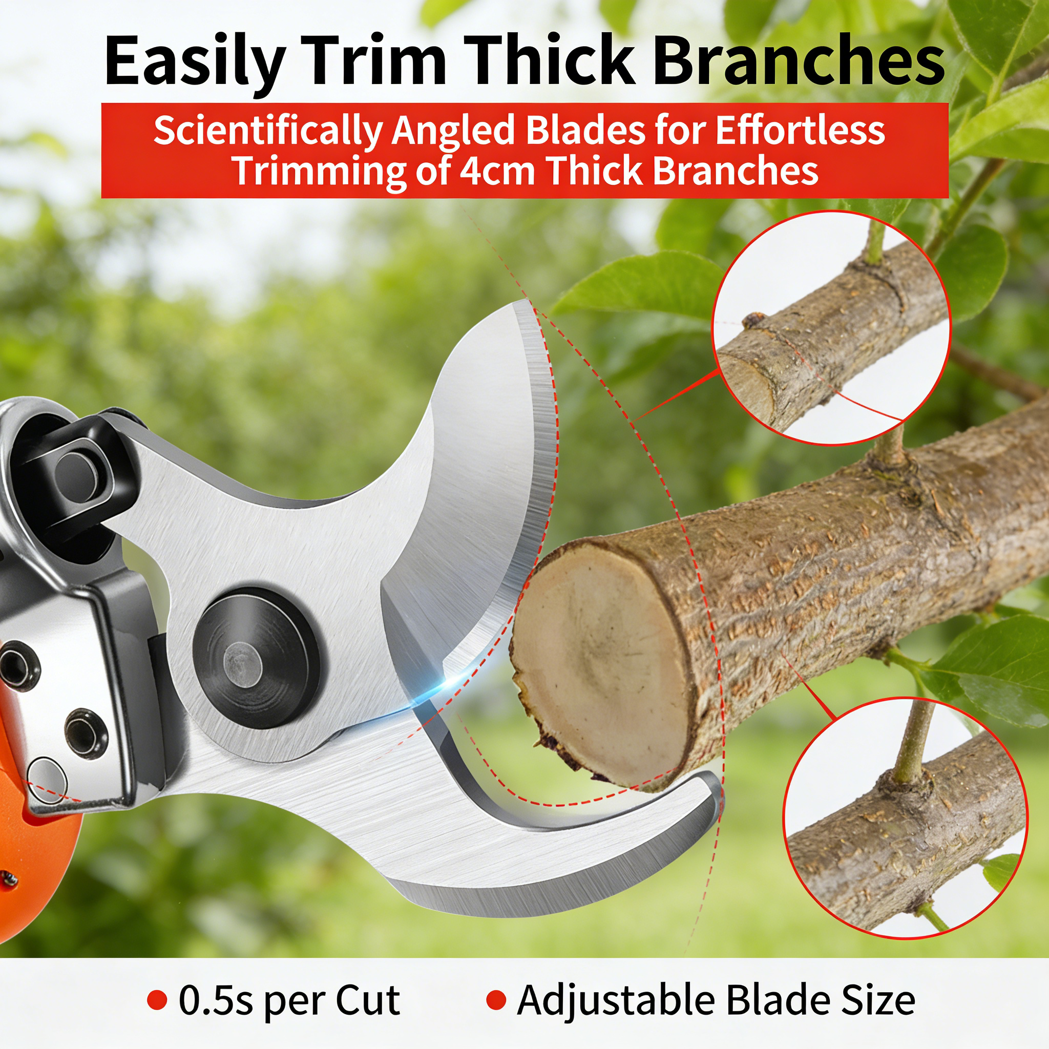 4.5cm maximum cutting diameter, easily cut through thick branches of fruit trees (peach, apple, pear tree) and garden shrubs, no need for repeated cutting, efficient and labor-saving.