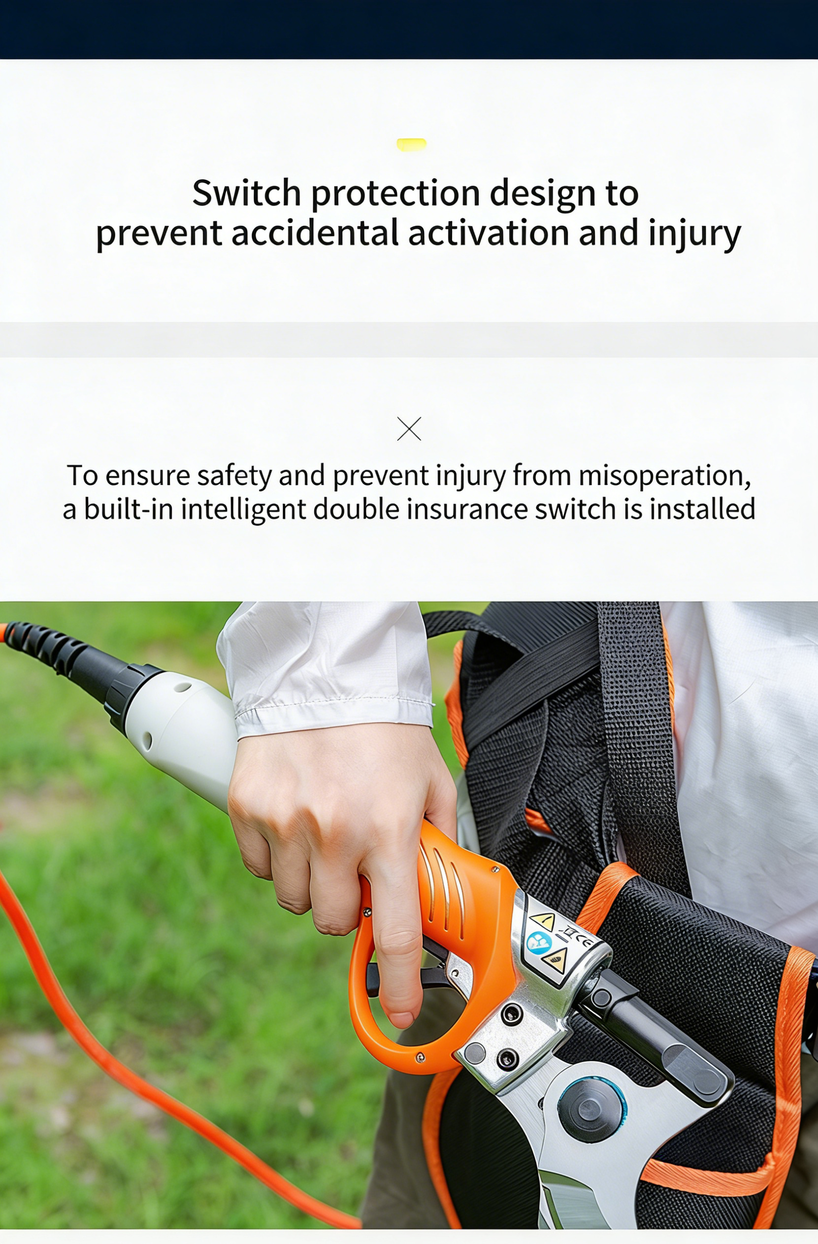 Built-in safety switch design, prevent accidental startup and avoid personal injury; stable motor operation, low noise and low vibration, providing a comfortable use experience; overload protection function, effectively protect the motor and extend the service life of the product.
