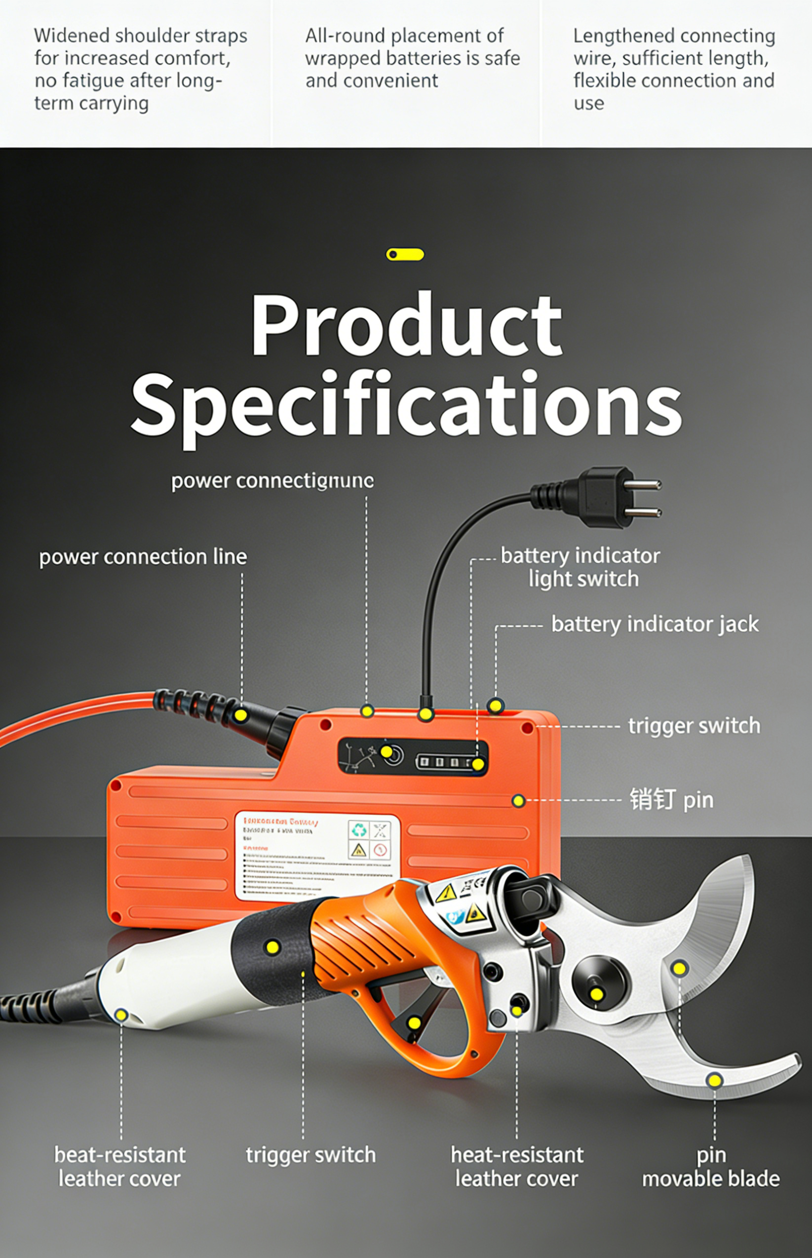 Equipped with high-capacity rechargeable lithium battery, long battery life, one full charge can support a large amount of pruning work; USB/standard charging port, convenient charging at home, in the garden or by car, no need to replace dry batteries, environmentally friendly and economical.