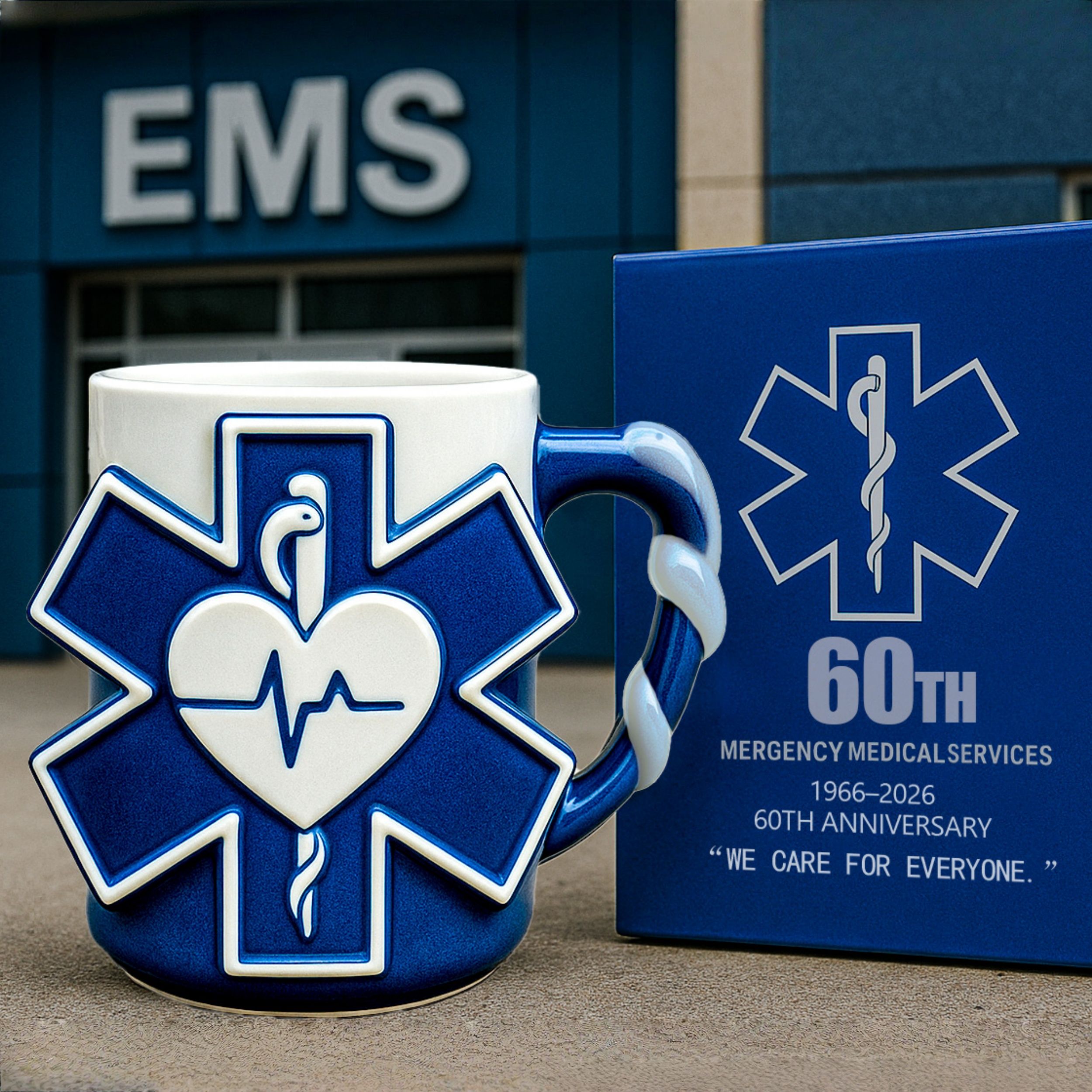 🚑 60 Years of Care and Commitment💙Celebrate the 60th Anniversary of Emergency Medical Services (1966–2026) with this exclusive commemorative mug, designed with the iconic EMS Star of Life and heartbeat emblem.