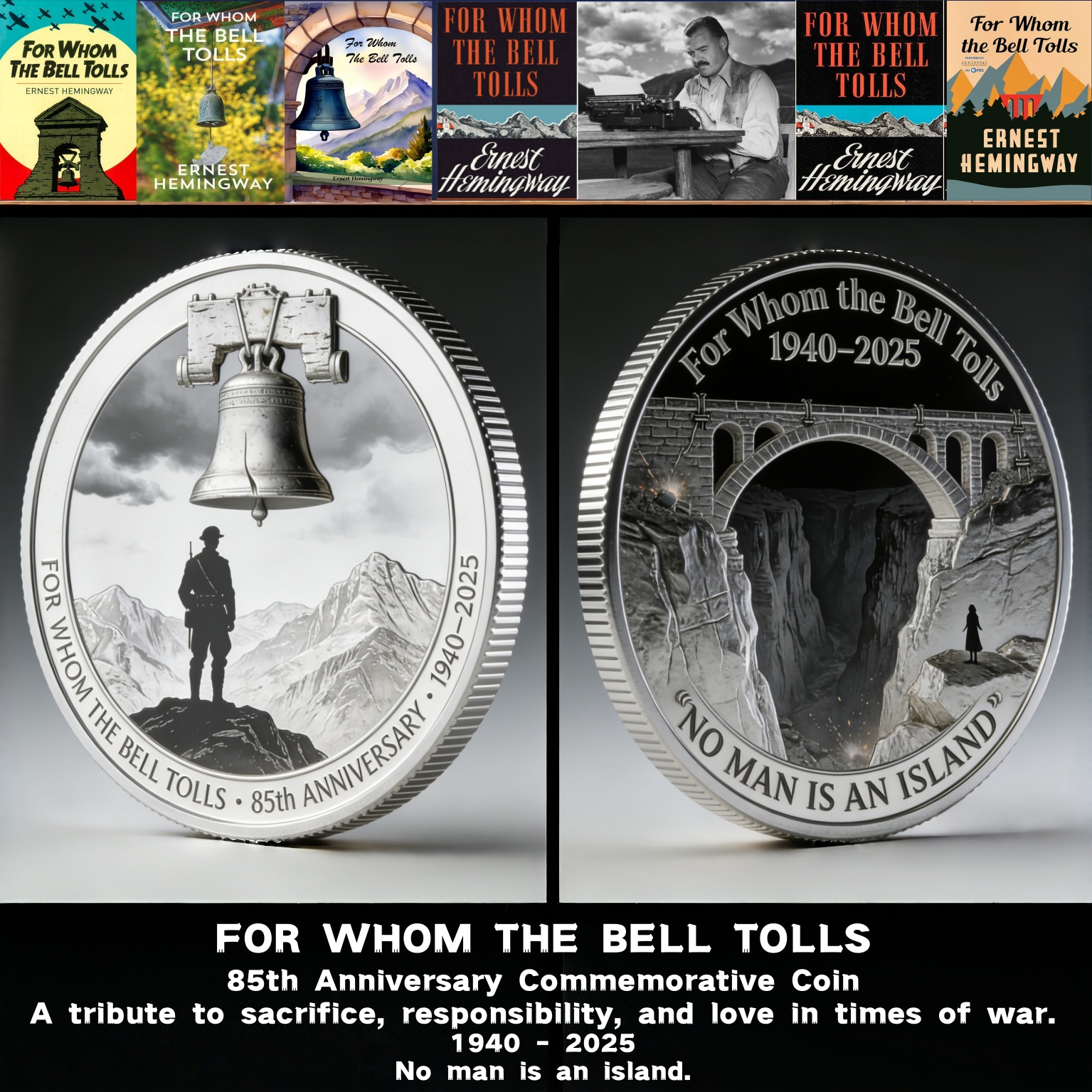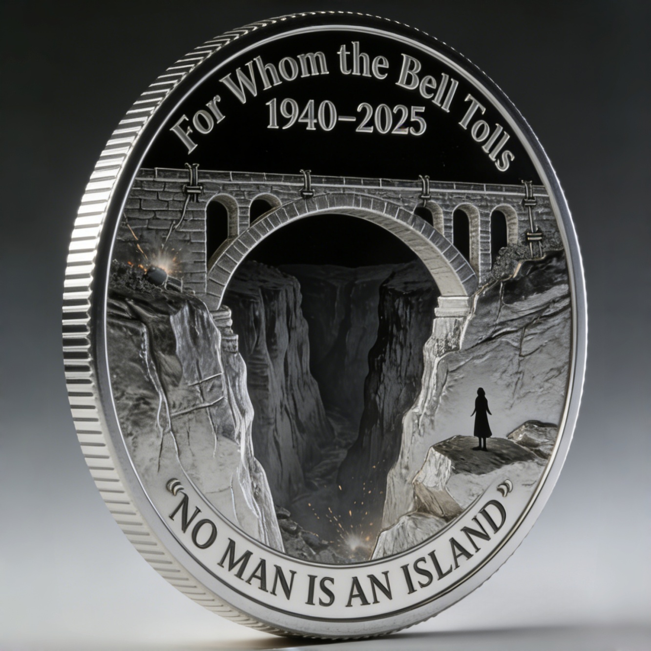 📖 Every engraved detail draws from For Whom the Bell Tolls — the hanging bell, the lone figure, the fractured bridge — symbols of sacrifice, responsibility, and the truth that no one stands alone.