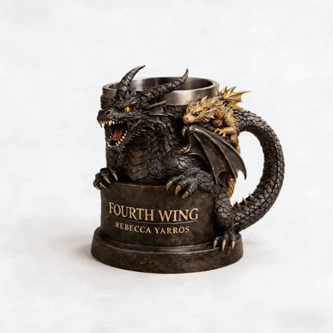 🐉🔥Summon the riders’ tavern straight to your desk. This Fourth Wing · Bonded Dragons Tankard captures the ferocity of Tairn and the bright spark of Andarna in a single, display-worthy mug. The exterior is sculpted with dense dragon-scale texture: the towering black dragon lunges forward with bared fangs and ember-bright eyes, while the smaller golden dragon coils around the handle like a guardian, wings folded and ready to strike.