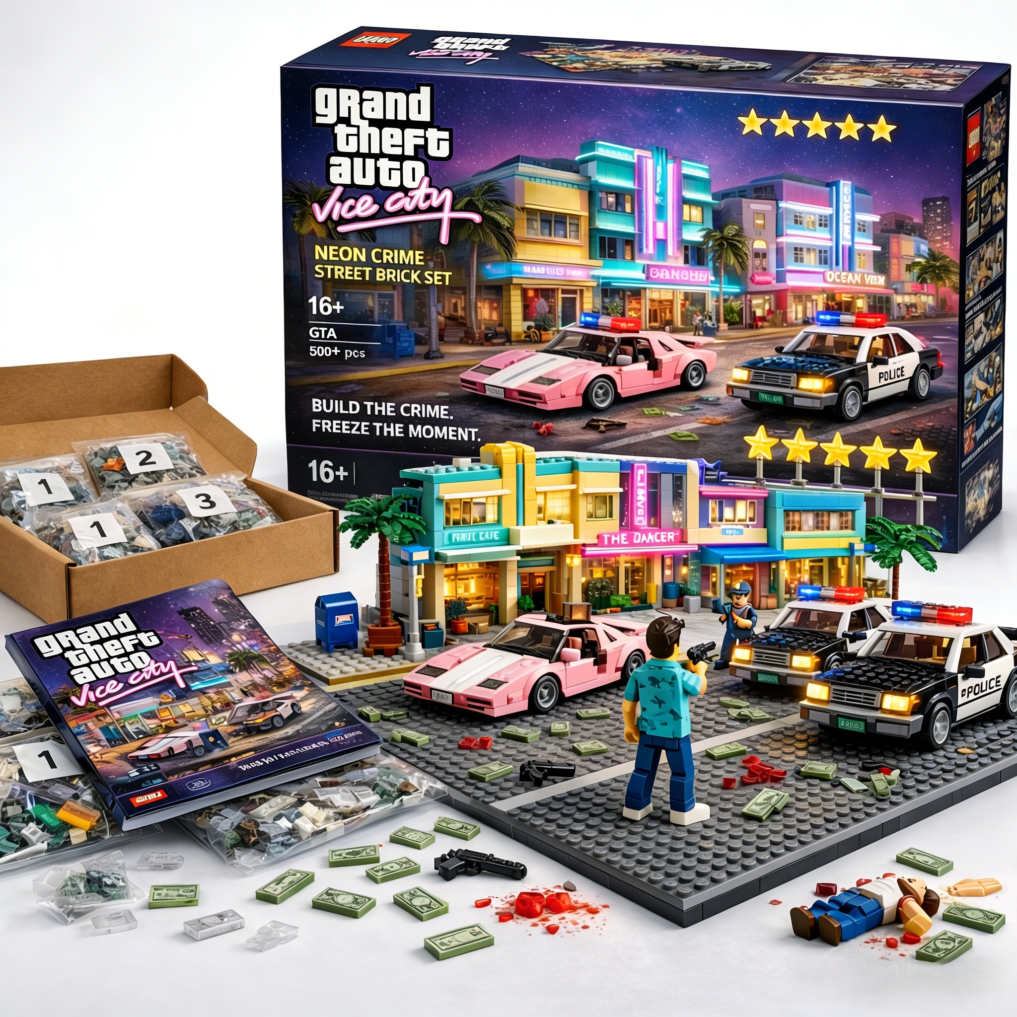 From the iconic pink sports car and flashing police lights to scattered cash and crime-scene details, this set recreates the raw, unforgettable atmosphere of Grand Theft Auto: Vice City. It’s the chaos, the freedom, and the attitude — frozen in one display-worthy moment.