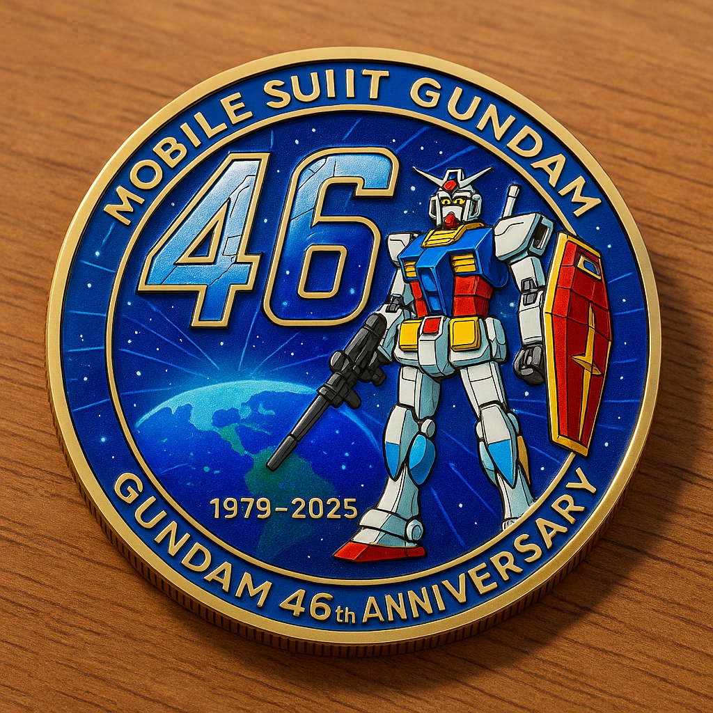 Feel the legacy of endless battles, towering heroes, and iconic design—etched in gleaming detail with the original RX-78-2 silhouette on the obverse and a golden anniversary crest on the reverse, crowned with your favorite mobile suit’s beam saber.