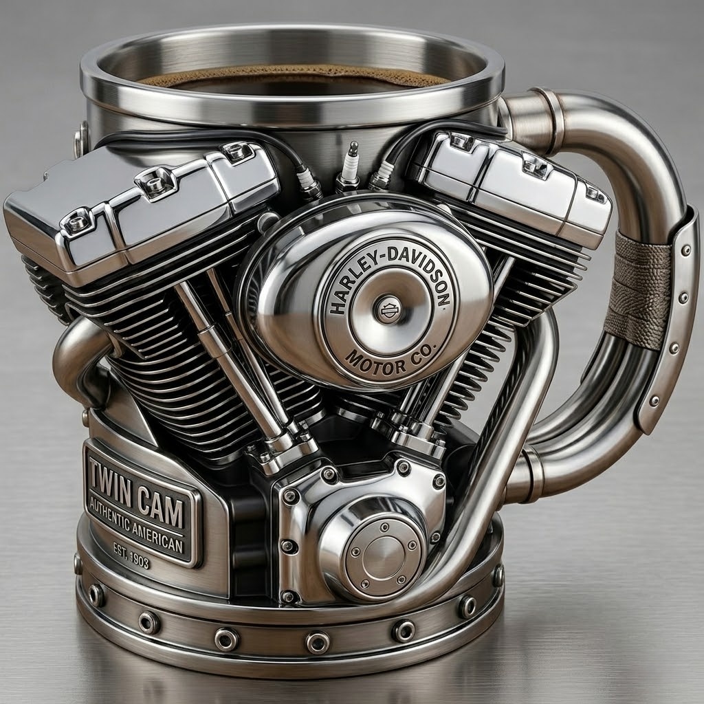 This stunning 3D mug is meticulously sculpted to replicate a real Twin Cam V-twin engine, complete with chrome-finished cylinders, detailed cooling fins, spark plugs, exhaust pipes, and authentic Harley-Davidson Motor Co. branding prominently displayed on the center cover.