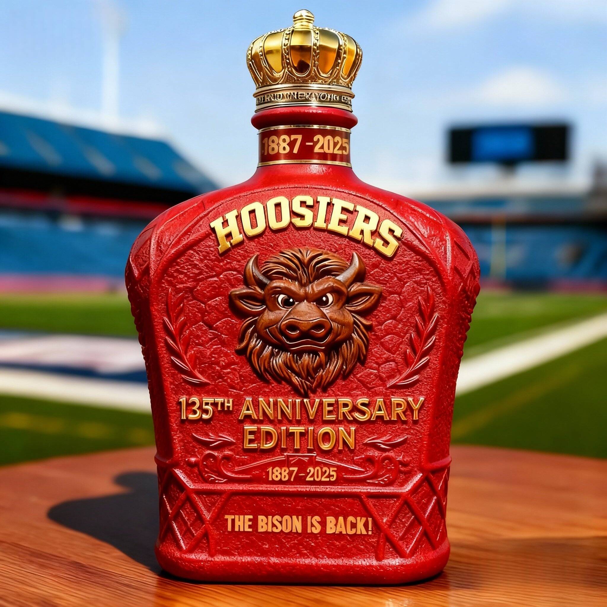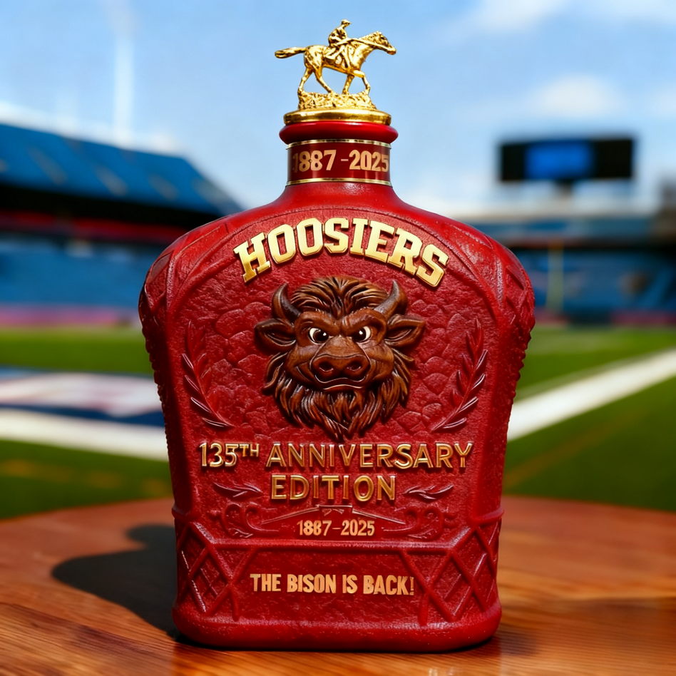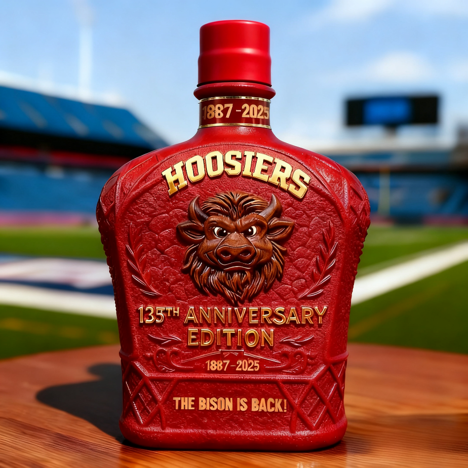 Adorned with the iconic bison emblem of Indiana University and crafted from striking crimson gloss glass, this bottle is a masterpiece that perfectly embodies the 138-year tradition, indomitable spirit, and unwavering pride of the Hoosiers. “1887-2025: The Bison is Back!” engraved on the bottle captures the electrifying energy of Memorial Stadium, where cheers and triumphs have resonated through generations. Each detail, from the regal golden crown to the sculpted bison motif, pays homage to Indiana University’s rich heritage and the triumphant return of its legendary mascot.