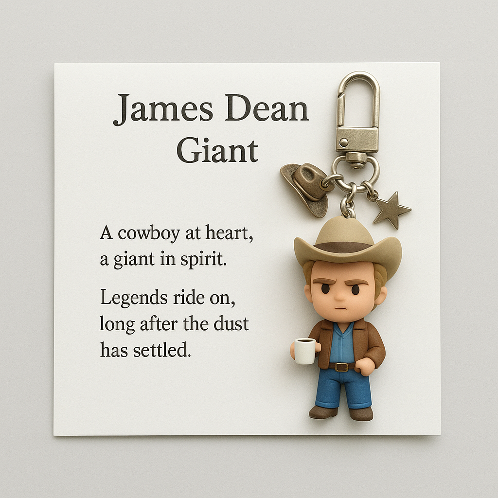 🌟 More than just a keychain, it’s a symbol of freedom and individuality. From the red jacket and film reel to the cowboy hat of ‘Giant,’ every detail is a tribute to a star who lived fast, stayed true, and left an eternal mark. 🤠🎥