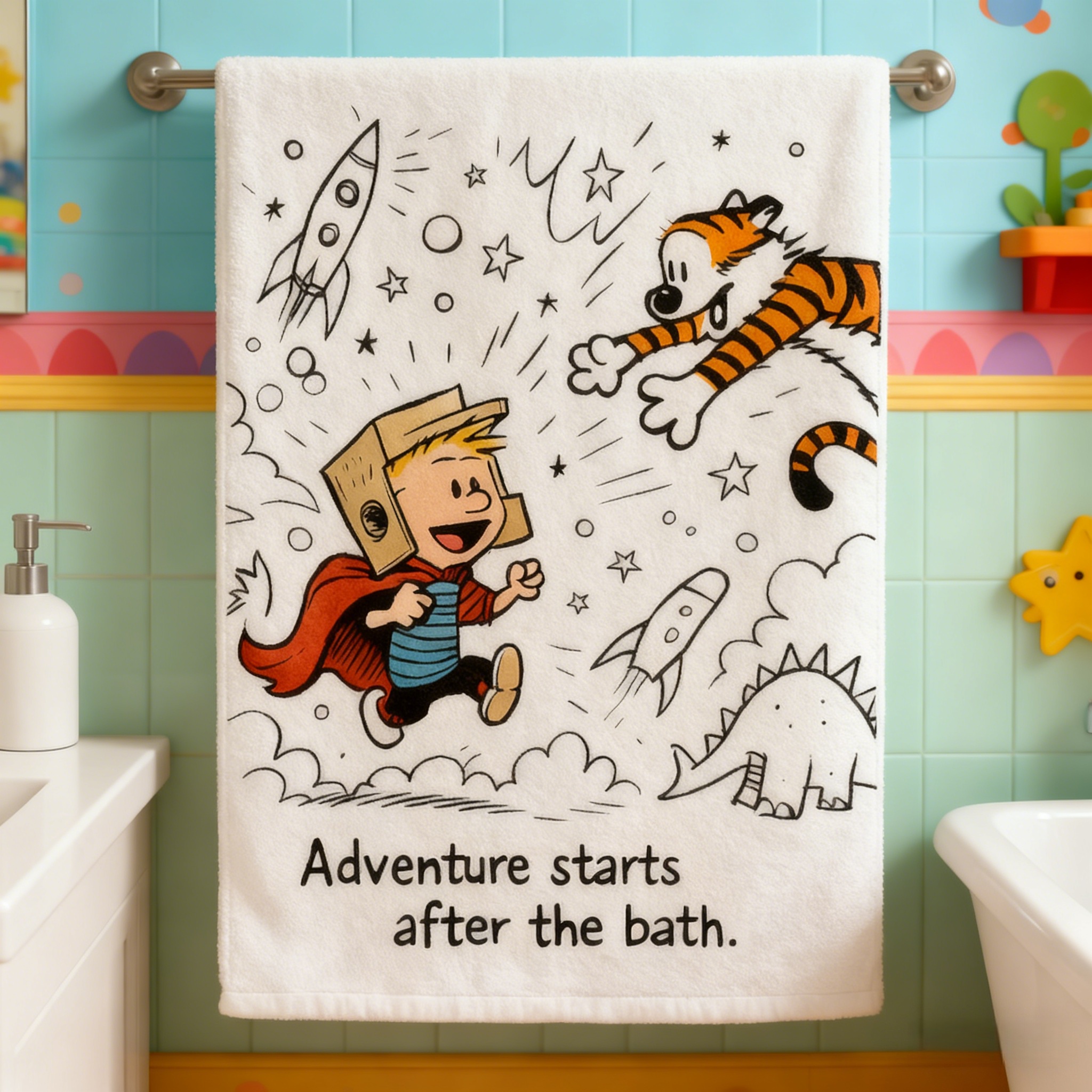 🌟 Turn bath time into the best part of the day.This towel brings Calvin & Hobbes’ imagination right into your bathroom—helping little ones dry off faster, laugh harder, and turn every bath into the start of a brand-new adventure.