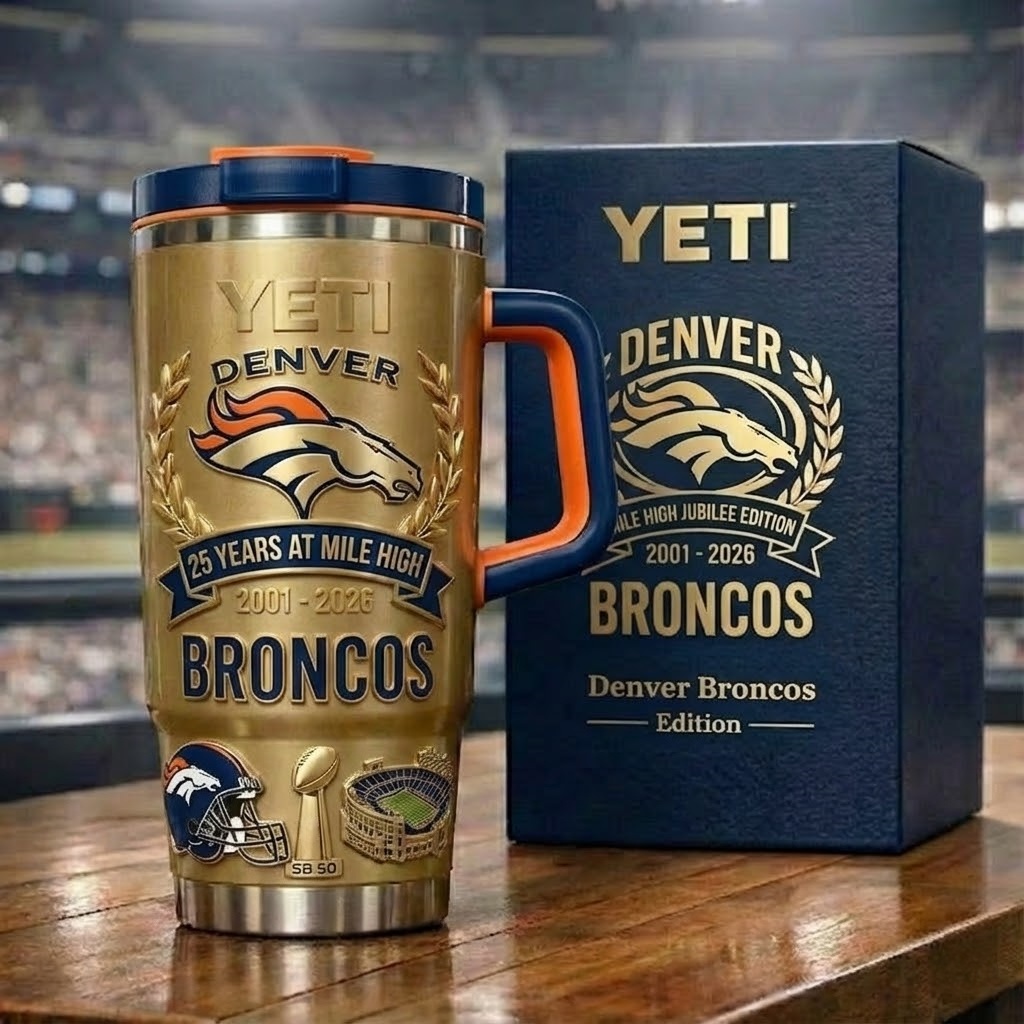 Celebrate 25 years of Mile High Magic! 🐴🏔️ This "Jubilee Edition" Gold Yeti honors the Broncos' home since 2001. Featuring the iconic stadium, helmet, and the SB 50 Lombardi Trophy. Keep your drink ice-cold at altitude. United in Orange! 🏈🔶🔷