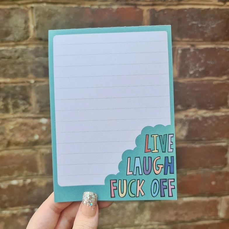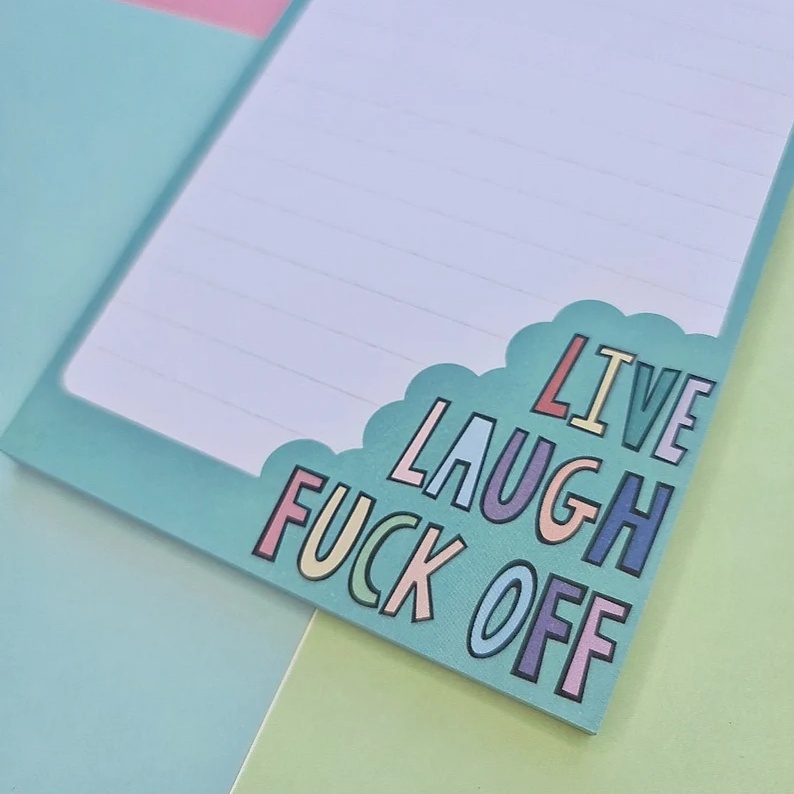 Let this notepad, labelled Live Laugh Fuck Off in the bottom left corner, remind you to live unencumbered and enjoy every moment!✨
