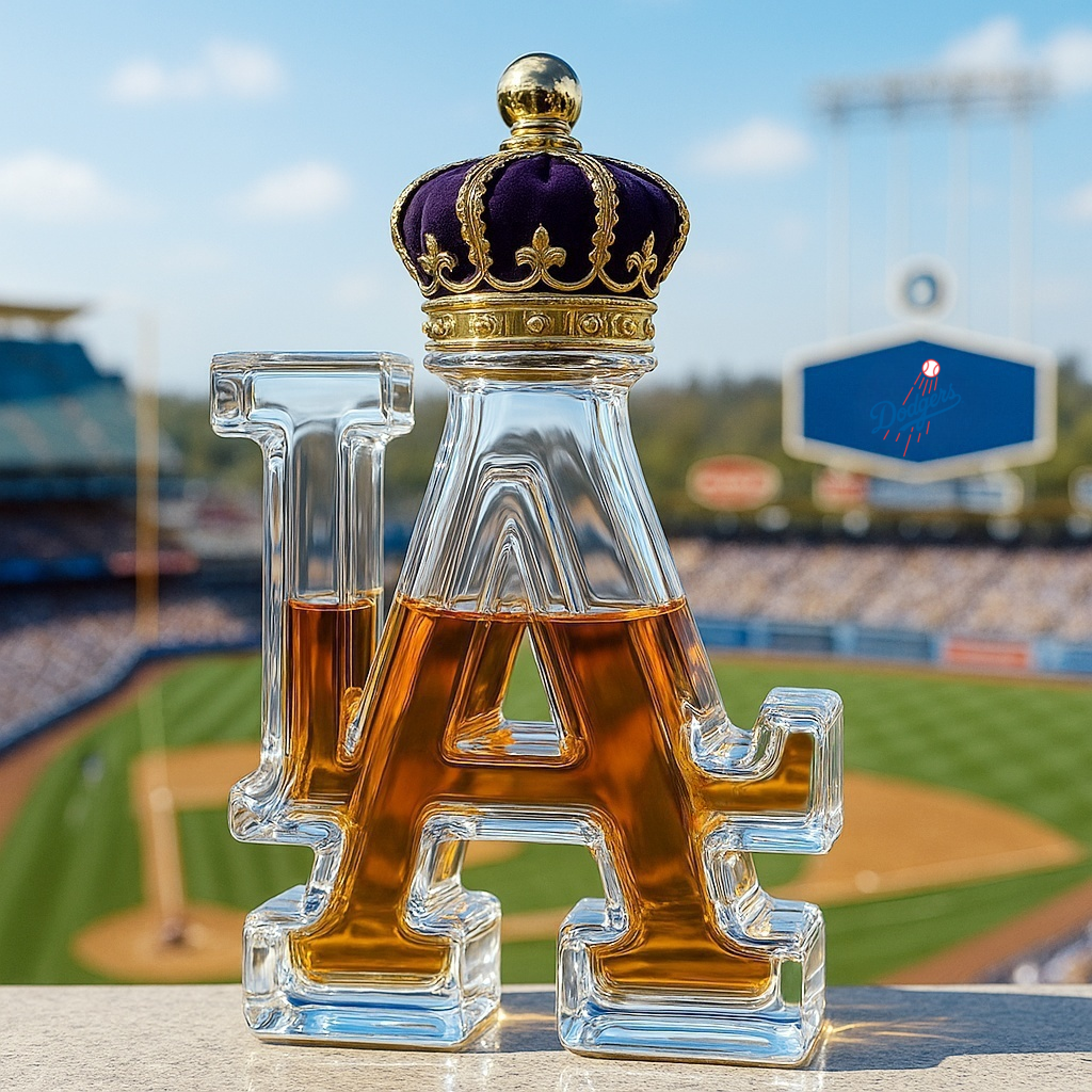 🌇🥃Shaped in the bold and iconic “LA” logo, this crystal-clear glass bottle is filled with golden amber spirit that shines like a California sunset .