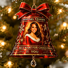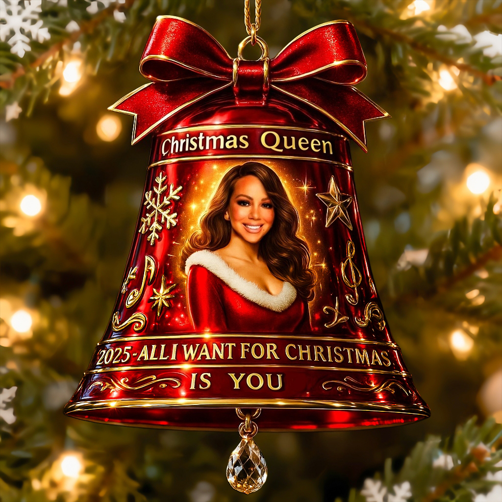 Featuring a glowing portrait of Mariah (in her signature red Santa gown), gilded snowflakes, music notes, and the iconic 2025 “All I Want for Christmas Is You” tag, the ornament catches tree lights like a stage sparkle and hums with festive soul. A one-of-a-kind collectible that turns your tree into a tribute to the ultimate Christmas bop.