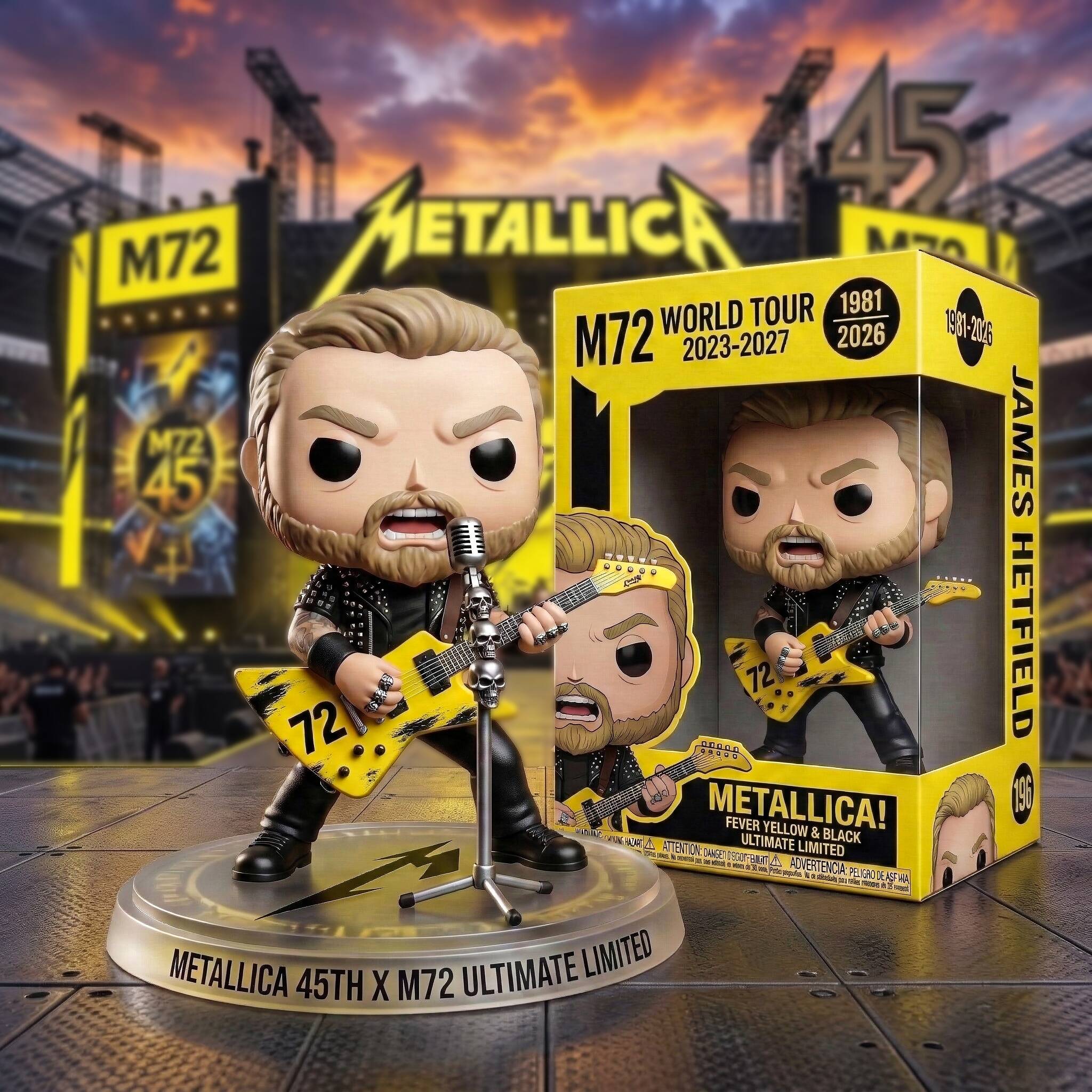 🎸 Ride the lightning. Celebrate 45 years of metal supremacy. Honor 45 years of Metallica and their monumental M72 World Tour with this "Fever Yellow & Black" Ultimate Limited-Edition figure. A tribute to the undisputed kings of heavy metal, this collectible captures the raw energy, deafening riffs, and unrelenting power that have defined generations of rock.