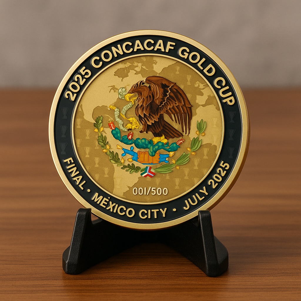 Struck in gleaming detail, the front showcases El Tri’s crest surrounded by laurel leaves and the words “Campeones 2025”, while the reverse features the Gold Cup trophy rising above a roaring stadium, lit with national pride.
