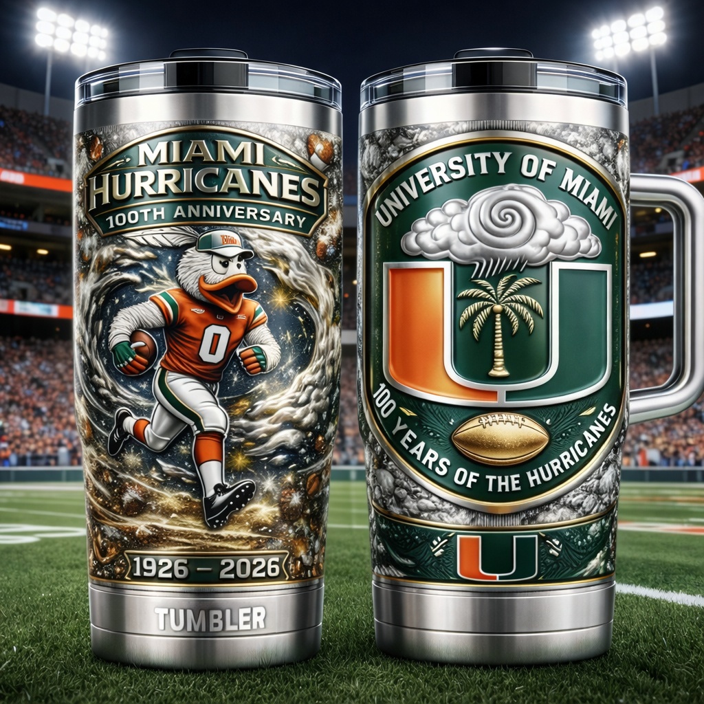 🔥 Finished in iconic green and orange with bold Hurricanes symbolism.Featuring the legendary mascot in full stride, swirling storm energy, the University of Miami “U” crest, and 1926–2026 anniversary detailing, this tumbler blends YETI durability with a century of Miami grit and dominance.