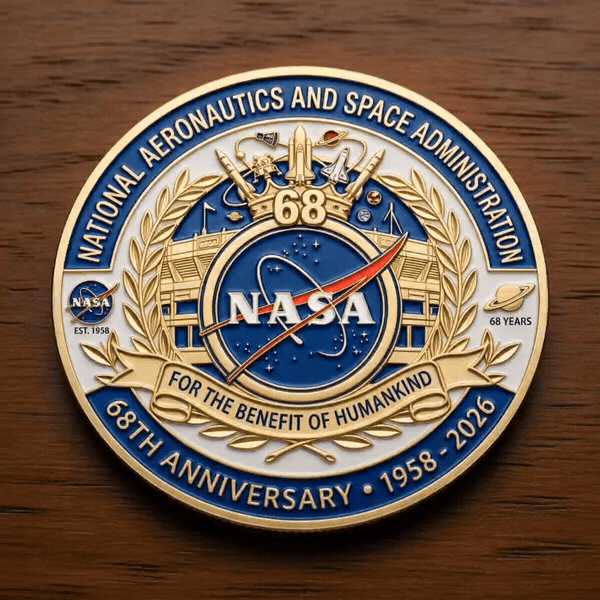 🚀 Celebrate 68 Years of Space Exploration. Mark NASA’s 68th anniversary with this intricately detailed commemorative coin. Featuring the NASA logo, historic spacecraft, and mission highlights, it honors decades of pioneering achievements in aeronautics and space exploration.