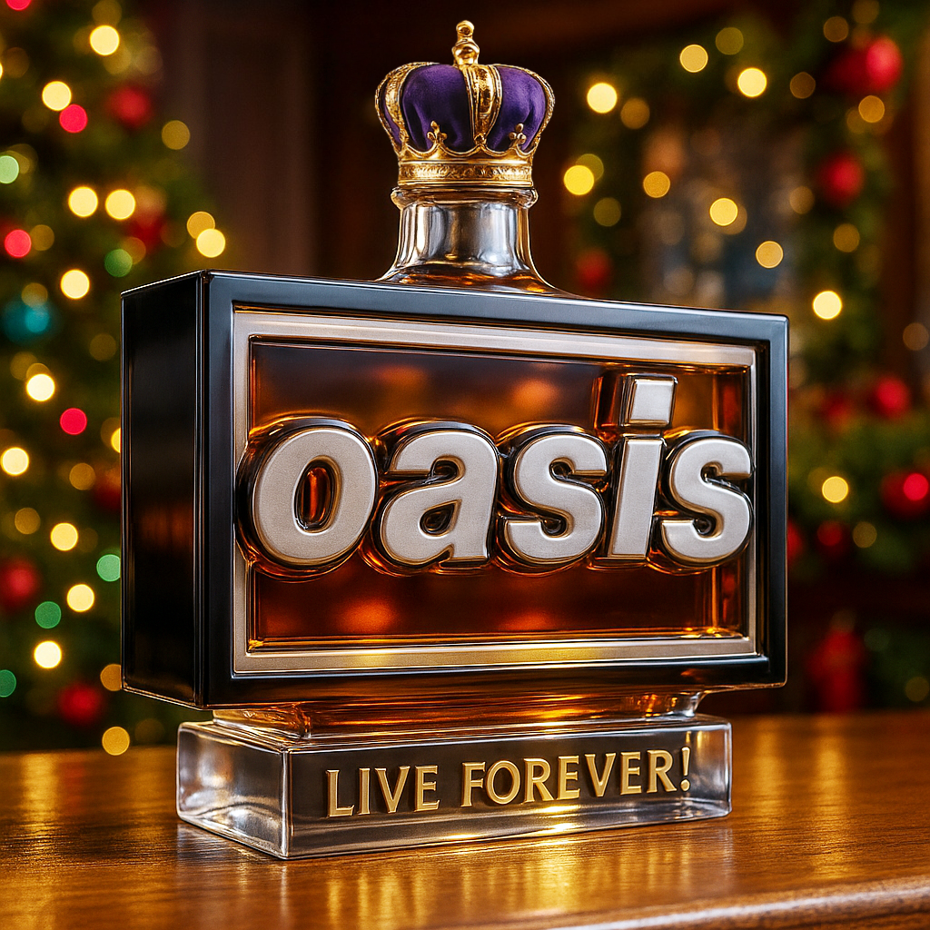 Inspired by one of the most iconic bands of all time, this bottle takes the unmistakable Oasis logo and immortalizes it in bold 3D lettering, encased in a crystal-clear frame filled with rich amber whiskey, glowing like stage lights at the height of Britpop glory 🎤🔥.