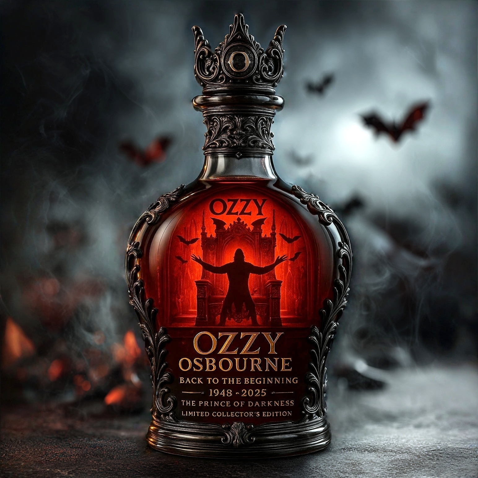 🦇 The crown of darkness is eternal—legends never fade. Raise a toast to the immortal legacy of the Father of Heavy Metal and Prince of Darkness — Ozzy Osbourne — with this “Back to the Beginning” Limited Edition Bottle and Collector’s Glass.