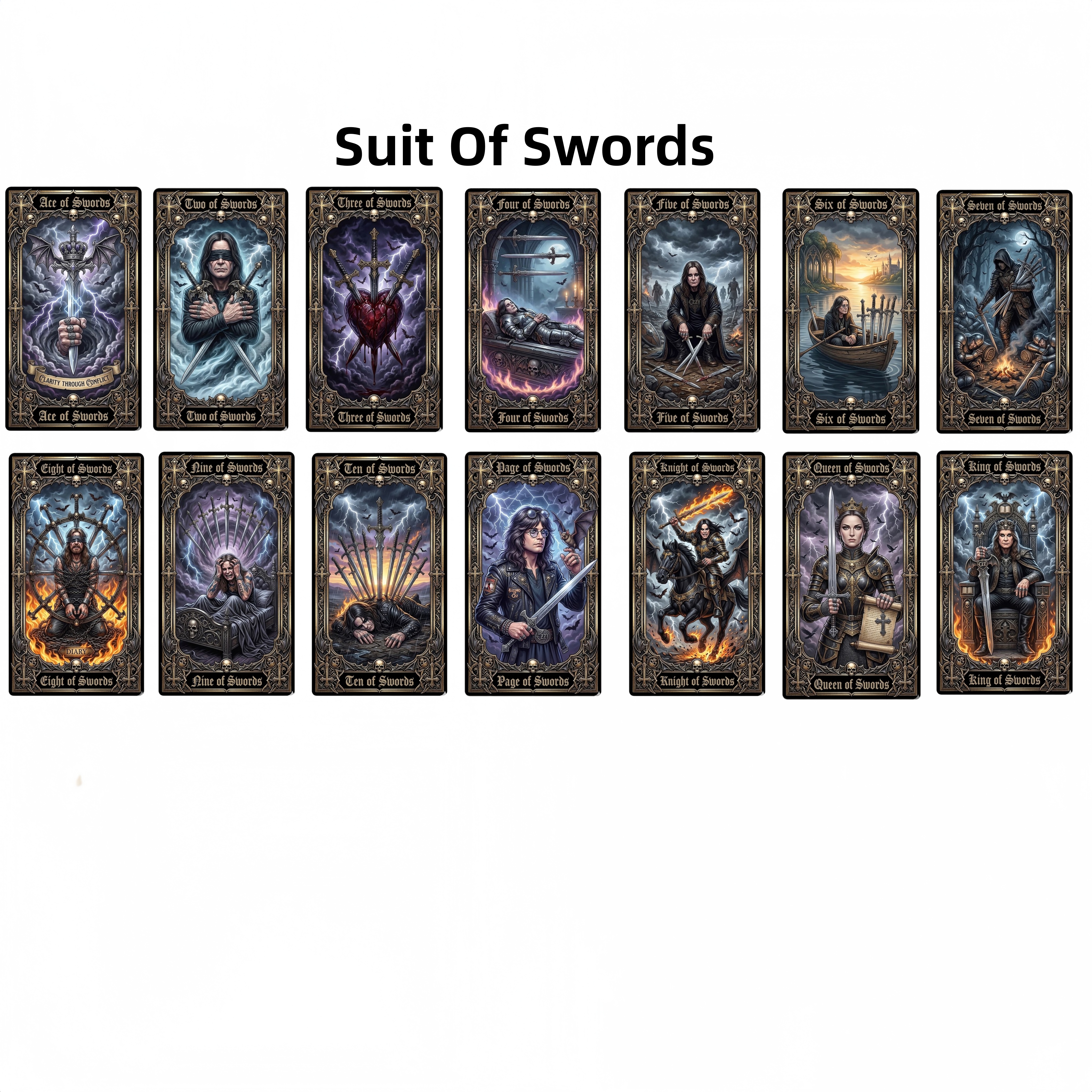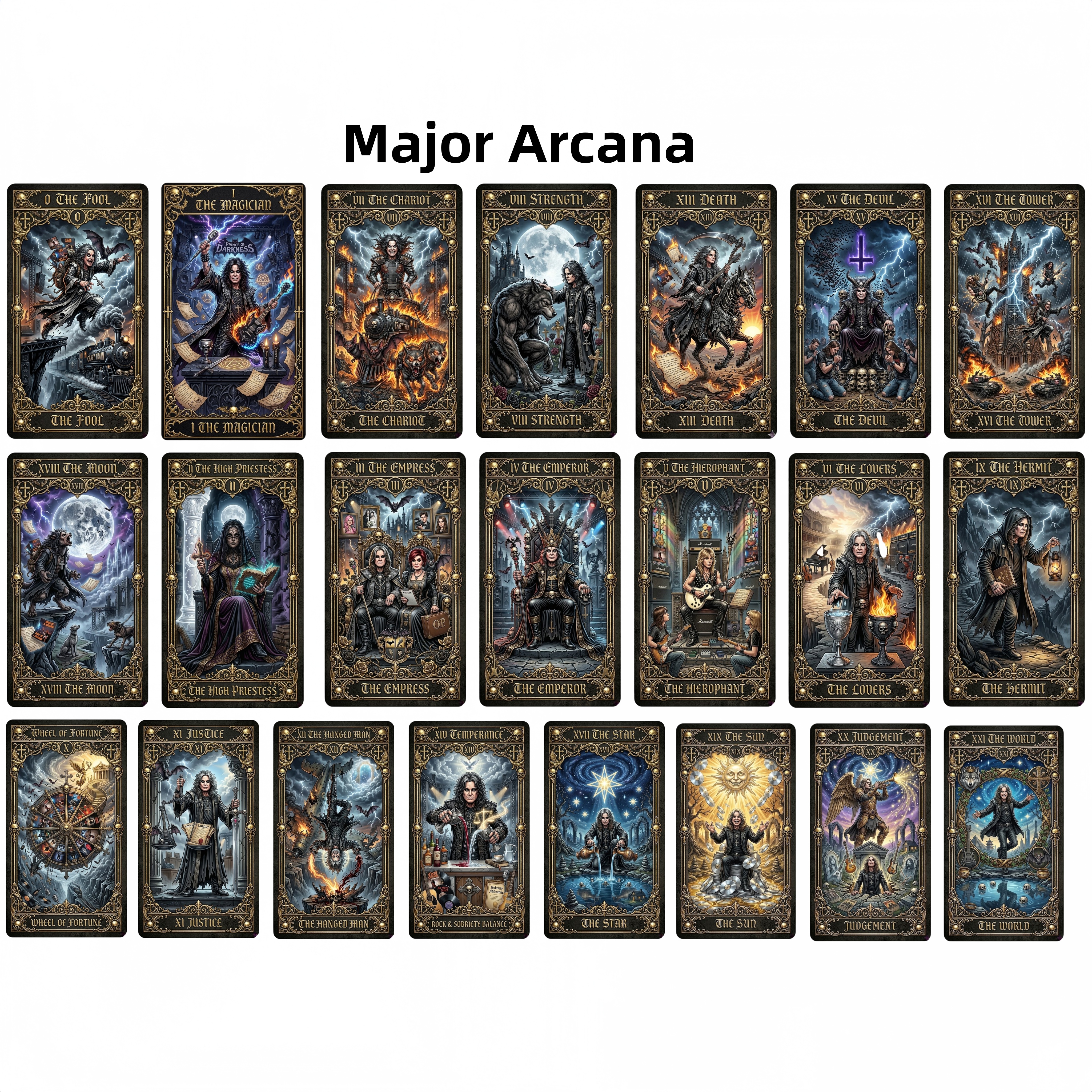 This limited-edition collector’s set explodes with gothic fantasy artwork where Ozzy himself becomes every major and minor arcana figure: The Fool leaps through stormy skies with bats and a flaming guitar, The Magician summons lightning and dark sorcery, The Chariot charges on a fiery war machine, Strength stands fearless beside a wolf under moonlight, Death rides a skeletal steed through hellfire, The Devil reigns on a throne of skulls, The Tower crumbles in apocalyptic chaos, The Moon howls with werewolves, and The High Priestess guards forbidden knowledge — every card pulses with Ozzy’s legendary persona, bat-winged intensity, blazing guitars, castles, ravens, and that unmistakable Prince of Darkness aura.