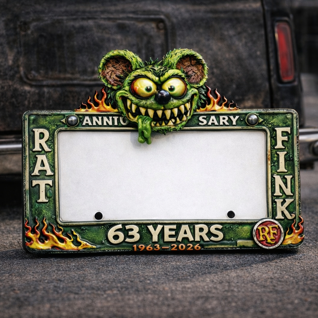🧟♂️🚗 Use this Rat Fink 63rd Anniversary License Plate Frame to raise hell in true hot rod legend style.