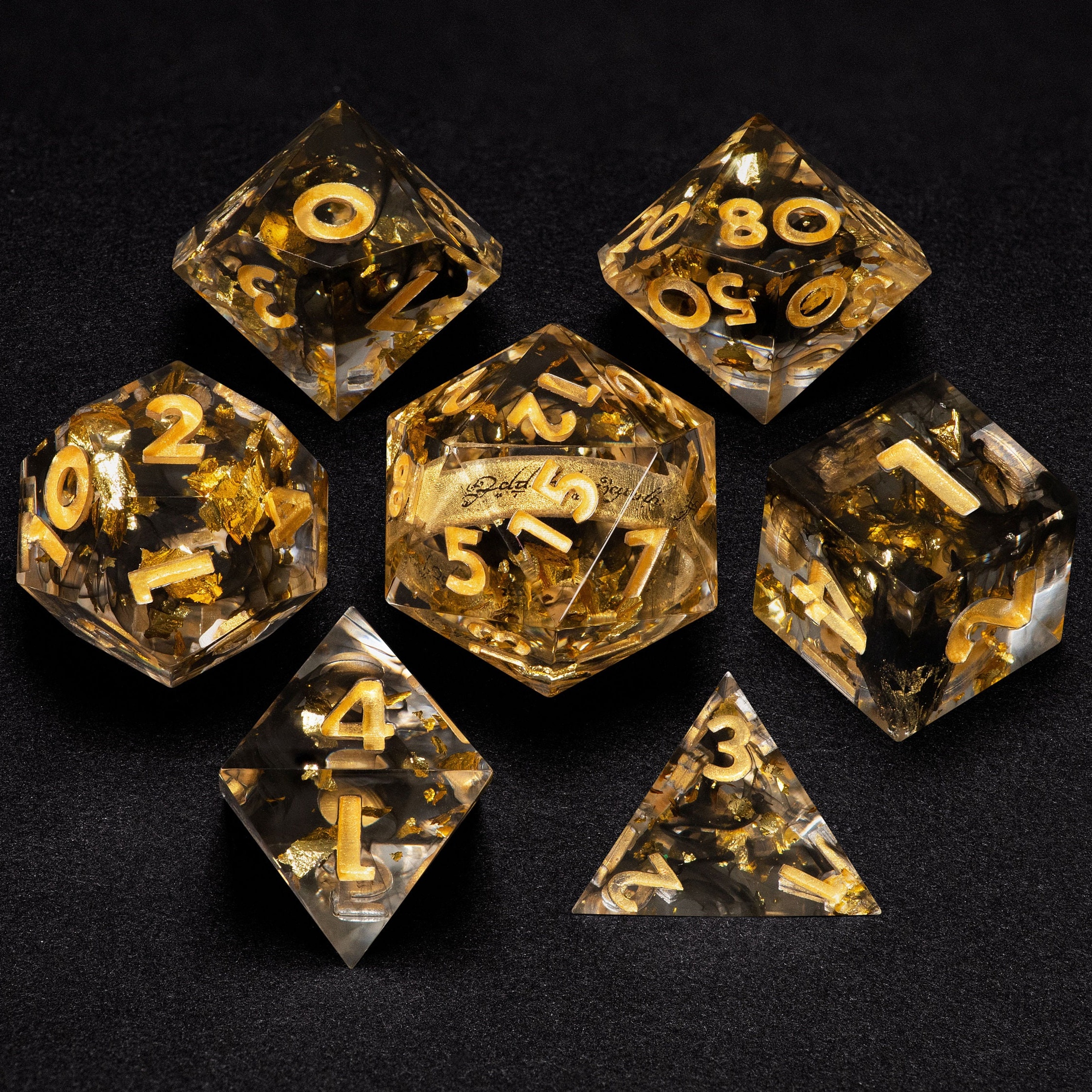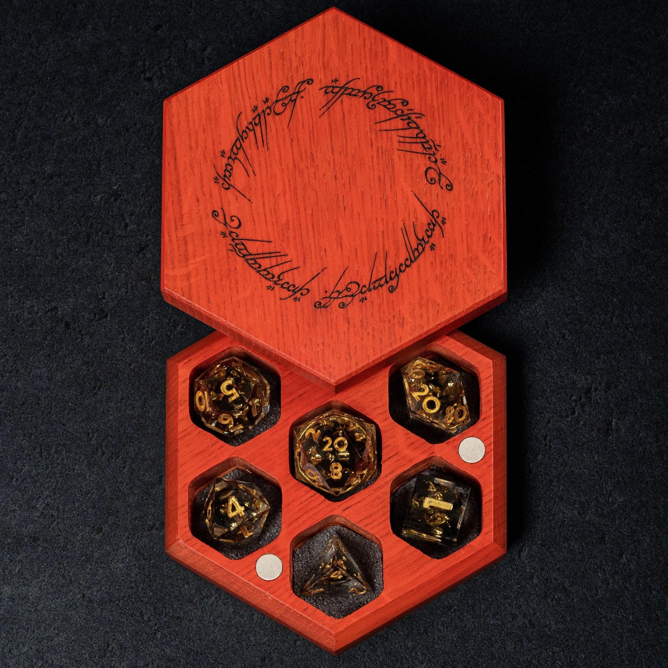 ✨Inspired by LOTR theme this dice set features glittering gold dice, with One ring inside the D20, and Dark Lord helmet in the D6.