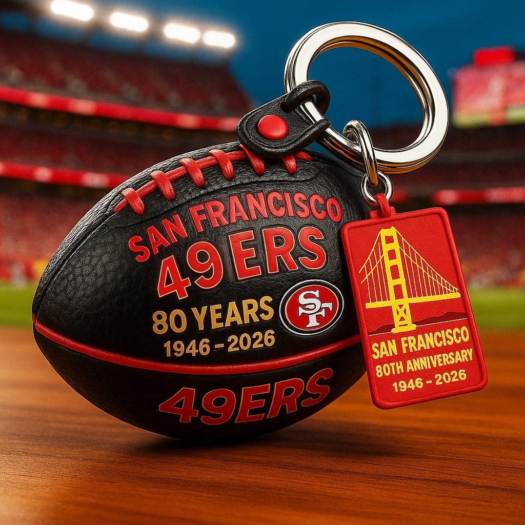 🏈 80 Years of Faithful Football. From 1946 to 2026, this exclusive 49ers anniversary keychain honors eight decades of San Francisco pride — a journey of legends, loyalty, and unforgettable moments.