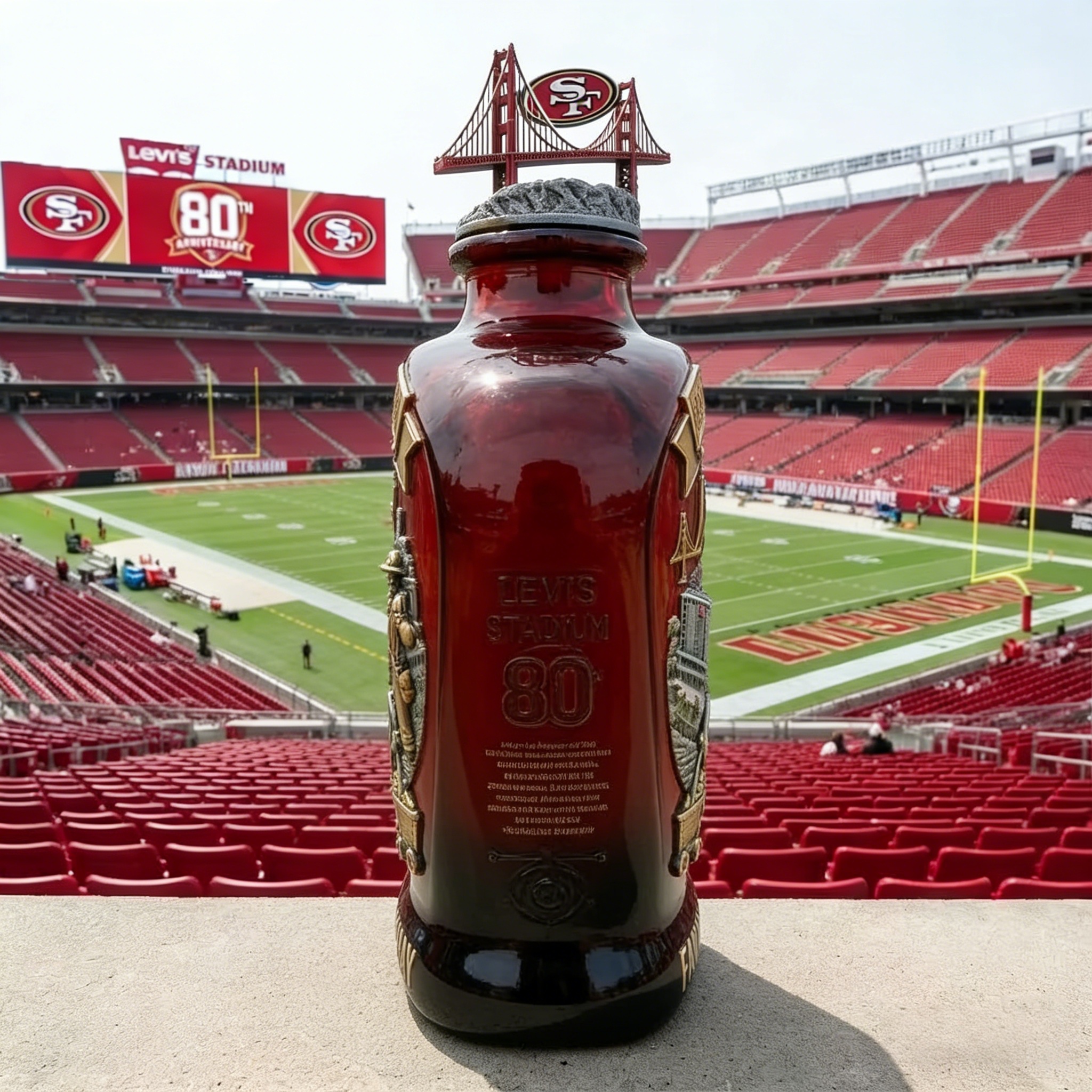 🏟️🏈⛏️Eighty years of red and gold. Eighty years of the Faithful.This San Francisco 49ers 80th Anniversary commemorative bottle brings the entire story of the franchise into one display piece for your bar, shelf, or game-day shrine.