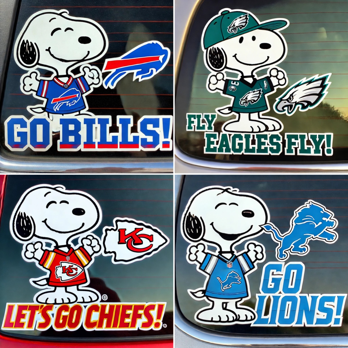 Cheer for your favorite NFL team in the most playful way possible—Snoopy style! This vibrant support decal combines the iconic Peanuts beagle with bold team colors and logos, making every drive a touchdown-worthy statement.
