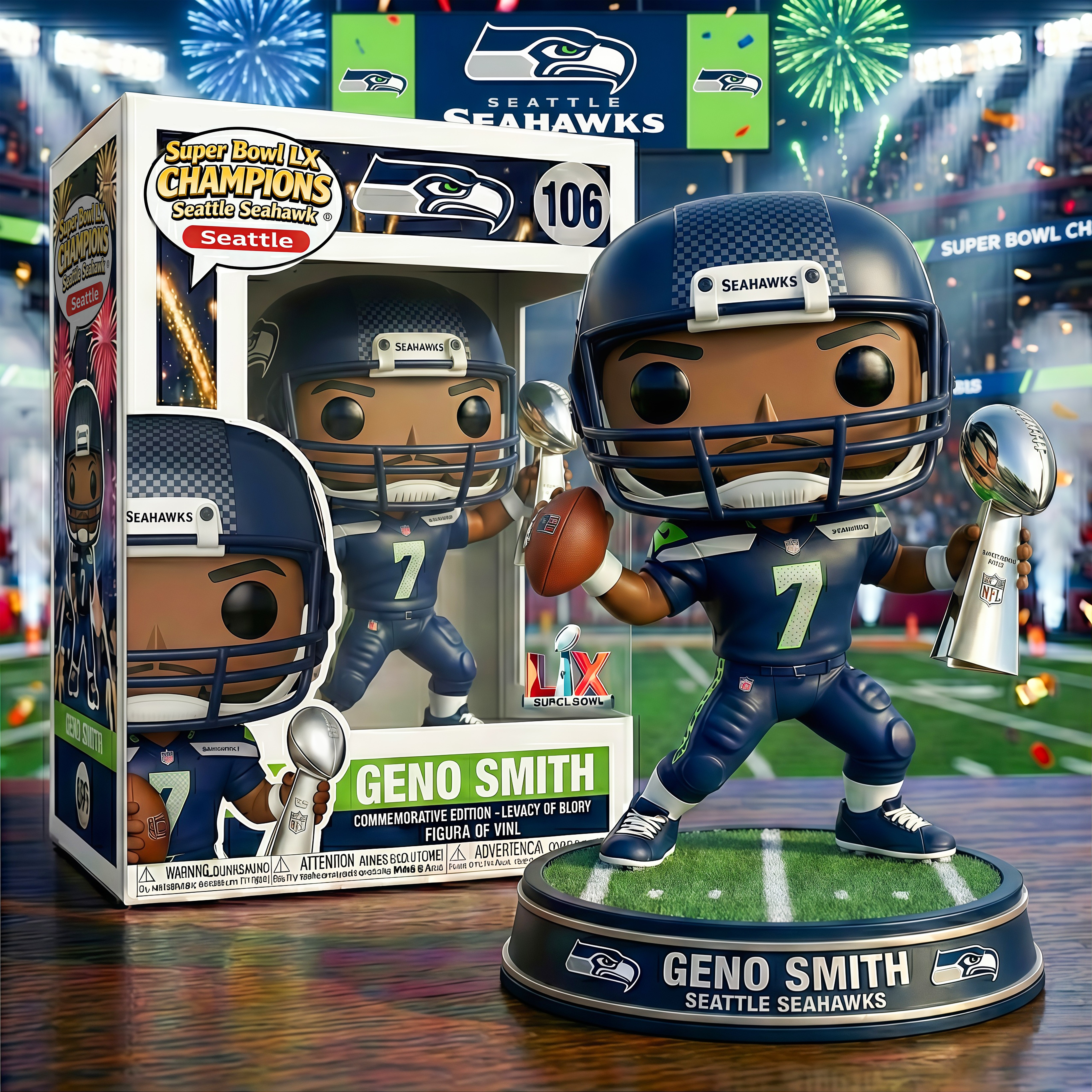 🏆 This collectible Pop! figure celebrates the moment Seattle Seahawks reached the summit of the NFL world. Under stadium lights and falling confetti, victory became history — and this figure captures it forever.